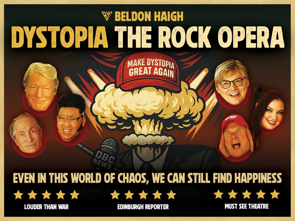 Blistering musicality, razor sharp political satire and spectacular masks collide as a prison band of dictators and traitors takes you on an exhilarating journey from tyranny to enlightenment. Dystopia was one of the most highly praised shows of Edinburgh Fringe 2025.