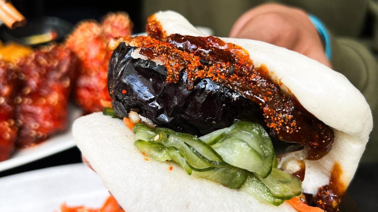 Theatre fans can also fill pillowy Hirata buns with Japanese Fried Chicken and Miso Grilled Aubergine. Flesh & Buns’ JFC is marinated in buttermilk and served with rocoto chilli BBQ mayo. The aubergine is richly coated in sweet miso, and served with carrot and cucumber pickles.